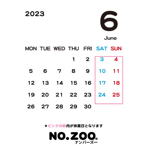 6月のショップ休業日はピンクの枠内となります。